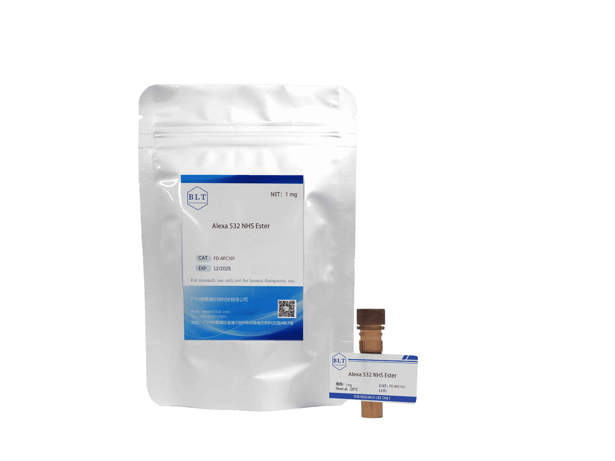 Alexa 532 NHS Ester等同于Thermofisher的Alexa Fluor 532 NHS 酯熒光染料,Alexa Fluor 532 NHS的熒光在較寬的pH范圍內(nèi)(4 – 10)保持不變且不易發(fā)生分子間聚集,多個染料分子標記同一蛋白時,不易熒光自淬滅或引起蛋白聚集,是用于標記蛋白、胺修飾的寡核苷酸和其他含胺分子的水溶性小分子綠色熒光標記染料之一。