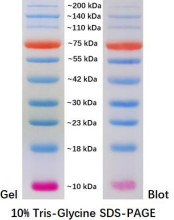 本產(chǎn)品彩色預(yù)染蛋白 Marker 由 10 種高純度并預(yù)染的重組蛋白質(zhì)組成,在 Tris-Glycine gel 中指示分子量范圍為 10-200 kDa(~10、~18、~23、~30、~42、~55、~75、~110、~140、~200 kDa),其中 75 kDa 為橙紅色條帶,10 kDa 為玫紅色條帶,其他均為藍(lán)色條帶,方便動態(tài)觀察蛋白質(zhì)電泳狀態(tài)或判斷蛋白質(zhì)轉(zhuǎn)膜效果。適合作為 SDS-PAGE 和 Western blot 的蛋白質(zhì)分子量標(biāo)準(zhǔn)。
