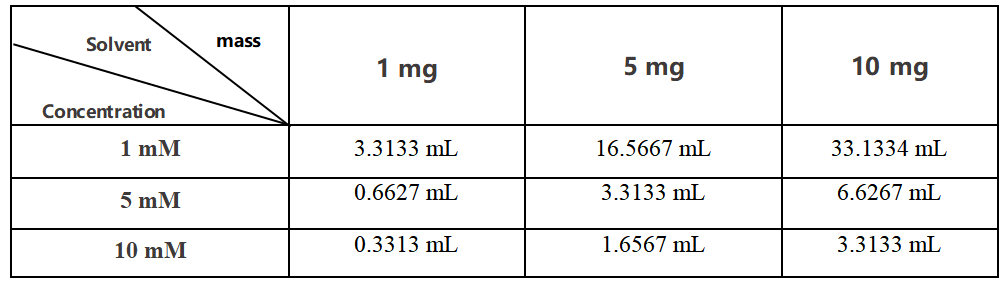 注:請根據(jù)產品在不同溶劑中的溶解度選擇合適的溶劑配制儲備液;一旦配成溶液,請分裝保存,避免反復凍融造成的產品失效。
