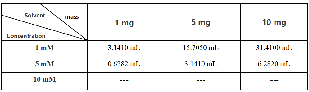 注:請(qǐng)根據(jù)產(chǎn)品在不同溶劑中的溶解度選擇合適的溶劑配制儲(chǔ)備液;一旦配成溶液,請(qǐng)分裝保存,避免反復(fù)凍融造成的產(chǎn)品失效。