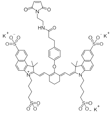 Sulfo-IR820 Maleimide是一款較強水溶性的近紅外(NIR)熒光染料,與IR820相比,具有更好的光學/化學穩(wěn)定性,甚至可在近紅外二區(qū)(>1000nm)進行熒光發(fā)射,使其在組織深部成像方面具有優(yōu)勢,可以穿透組織更深層次,減少光散射和吸收,用作光學成像、生物分子標記、藥物輸送和分子探針等生物醫(yī)學研究中的標記物。本產(chǎn)品結(jié)構包含Mal(馬來酰亞胺基團)反應性基團,而巰基(-SH)存在于半胱氨酸(Cys)的側(cè)鏈中。半胱氨酸通常作為蛋白質(zhì)二級或三級結(jié)構的一部分,會通過二硫鍵(-S-S-)實現(xiàn)側(cè)鏈之間的連接。在進行交聯(lián)反應時,必須將其還原成巰基,馬來酰亞胺對巰基具有較高反應活性,發(fā)生共價結(jié)合,由于分子結(jié)構中含有4個磺酸基團,具有較強水溶性和更高的偶聯(lián)效率,適合敏感蛋白的標記。