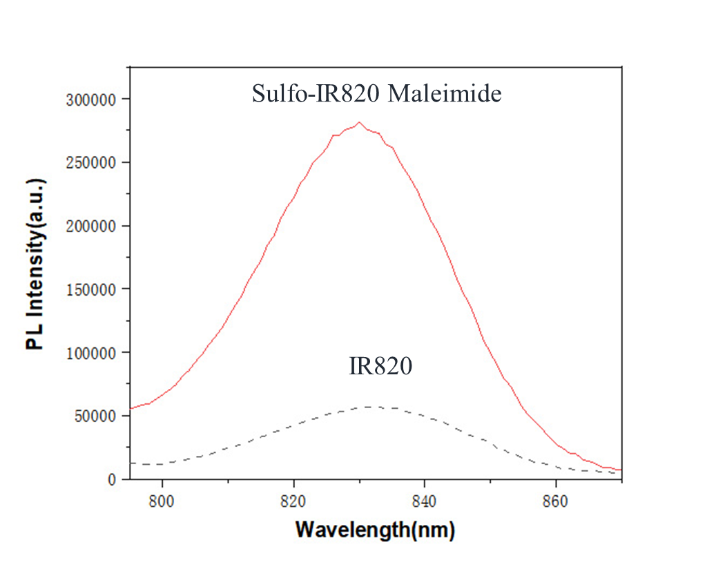| Sulfo-IR820 Maleimide和IR820在甲醇中的熒光光譜 |