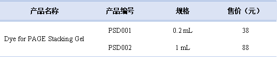 PAGE 濃縮膠染料(Dye for PAGE Stacking Gel, 1000×)是一種用于配制聚丙烯酰胺凝膠濃縮膠(上層 膠、積成膠)的染料,該染料有紅、橙、黃、藍、綠、 藍5種顏色可供選擇。添加該染料可以使得濃縮膠蛋白點樣孔一目了然,方便將蛋白樣品準(zhǔn)確無誤加入點樣孔中,易于判斷上樣孔邊距或是否歪曲破損。并且該染料的顏色不會隨著電泳而進入分離膠(下層膠),可穩(wěn)定的存在于濃縮膠中,電泳完成后也便于識別上層膠并切除,不會影響電泳和染色效果。