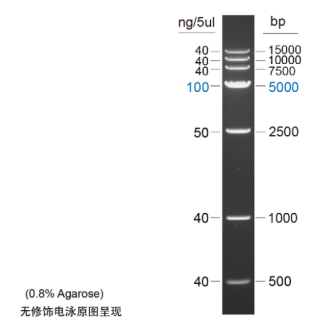條帶組成:本產(chǎn)品由500bp, 1000bp, 2500bp, 5000bp, 7500bp, 10000bp, 15000bp七條DNA條帶混合組成。