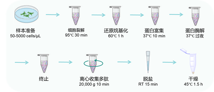 (5) 蛋白酶解:加入2 μL組分D(胰蛋白酶Trypsin),37 ℃酶解12-16 h。酶解結(jié)束后加入終濃度為1 %的甲酸FA終止酶解反應(yīng),并進(jìn)行超聲(<5 min),接著在20000 g下離心10 min收集上清中的多肽。