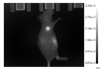2.對于體內(nèi)成像,首先使用0.5 mL / 1 mL的無菌1×PBS溶解粉末,使終濃度為0.2 nmol/μL,若用于小鼠腫瘤成像,尾靜脈或腹腔注射100 μL,注射后24小時(shí)左右觀察成像情況。探針通過肝臟進(jìn)行代謝,經(jīng)過腎臟,膀胱排出體外。