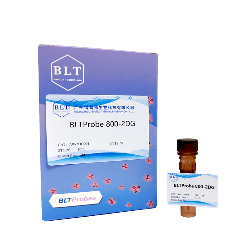 BLTProbe 800-2DG熒光探針產(chǎn)品是一款靶向腫瘤熒光探針,其標(biāo)記物BLTDye 800作為廣泛商業(yè)近紅外染料,擁有較高量子產(chǎn)率和較強(qiáng)的標(biāo)記能力,在蛋白質(zhì)印跡,免疫細(xì)胞化學(xué)檢測以及體內(nèi)成像應(yīng)用廣泛。BLTDye 800標(biāo)記的葡萄糖類似物(2-DG),是一種糖酵解靶標(biāo),由于癌細(xì)胞表現(xiàn)出較高的糖酵解率,對葡萄糖的需求增加以推動(dòng)腫瘤中的能量產(chǎn)生轉(zhuǎn)化為細(xì)胞表面葡萄糖轉(zhuǎn)運(yùn)蛋白的表達(dá)和活性升高,這可用于使用葡萄糖類似物進(jìn)行熒光成像,2-DG已被證明在多種腫瘤類型的體外測定和體內(nèi)動(dòng)物研究中結(jié)合腫瘤細(xì)胞,包括:A431(表皮)、SW620和CT26(結(jié)腸)、MDA-MB231和SKBr3(乳腺)、U87MG(膠質(zhì)母細(xì)胞瘤)等 。