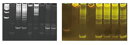 下圖顯示泡染LAMP擴(kuò)增產(chǎn)物5分鐘之內(nèi)的結(jié)果不管是用凝膠電泳成像儀還是在藍(lán)光激發(fā)下,其條帶均清晰明了,部分未參與擴(kuò)增的引物帶也能很清楚地顯現(xiàn)。 | 下圖顯示,對于HCR擴(kuò)增產(chǎn)物,其條帶均非常清晰。 |