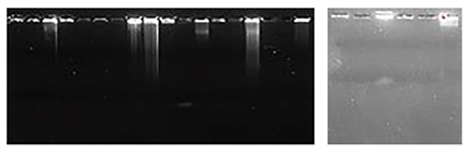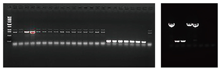 下圖均顯示客戶挑取單克隆菌落后進(jìn)行菌液PCR鑒定。 | 下圖顯示,對于RCA擴(kuò)增產(chǎn)物,可以清晰的看到在樣品孔中的亮帶。 |