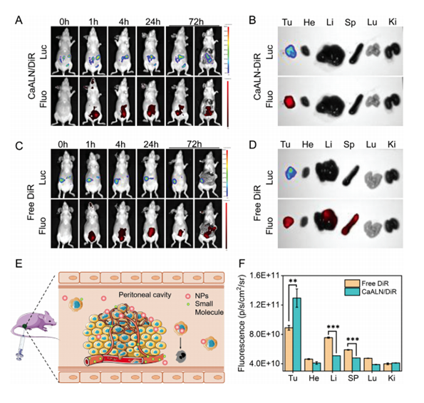 E) CaALN納米顆粒和小分子的體內(nèi)分布圖示。