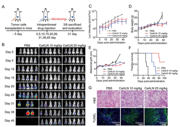 受其體外抗腫瘤活性和體內(nèi)腫瘤靶向能力的影響,作者進(jìn)一步評(píng)價(jià)了CaALN納米顆粒的體內(nèi)腫瘤抑制活性。腫瘤細(xì)胞移植5天后,攜帶SKOV3的小鼠分別用PBS和兩種不同劑量的CaALN(10和25mg/kg,n=8)處理。對(duì)其中5只小鼠進(jìn)行定期成像并通過(guò)收集體重、腹圍和生存數(shù)據(jù)進(jìn)行監(jiān)測(cè)。(圖4 A)。