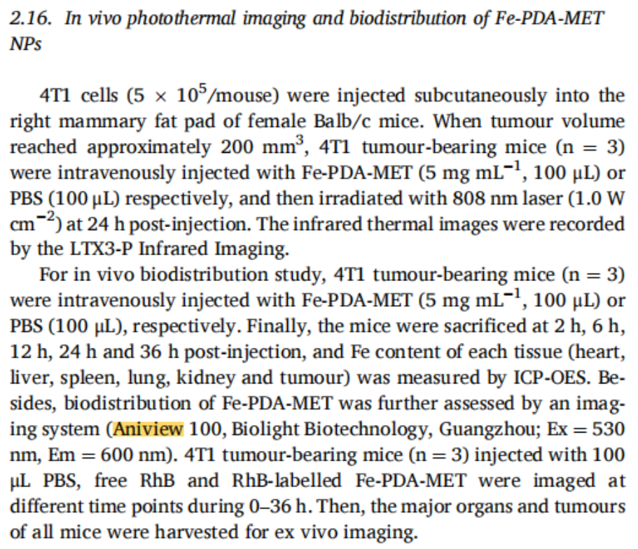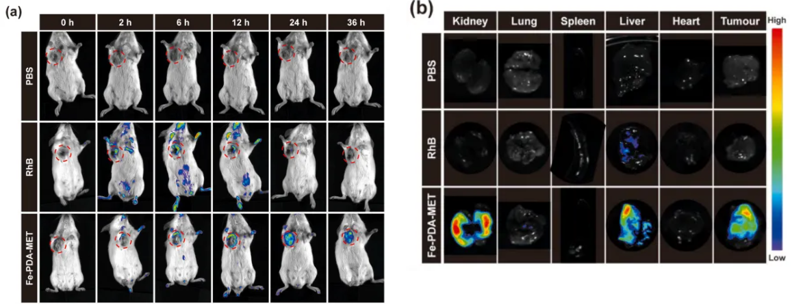 在文章中,為了驗證納米粒對腫瘤的靶向效應(yīng)和生物組織分布,研究團隊使用博鷺騰AniView多模式動物活體成像系統(tǒng)對小鼠進行活體和離體組織的熒光成像。結(jié)果表明,RhB 標(biāo)記的 Fe-PDA-MET 納米顆粒在靜脈注射 2h 后可在腫瘤部位檢測到熒光信號,24h 時信號強度達到最大,36h 時仍能檢測到,這表明 Fe-PDA-MET NPs 能夠在腫瘤部位有效積累,且在體內(nèi)具有較長的留存時間,而游離 RhB 會被快速代謝。