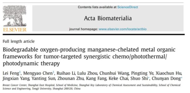 近日,同濟大學化學科學與工程學院石碩教授和同濟大學附屬東方醫(yī)院董春燕教授課題組跨學科合作研究的最新成果“Biodegradable oxygen-producing manganese-chelated metal organic frameworks for tumor-targeted synergistic chemo/photothermal/photodynamic therapy”發(fā)表在材料科學綜合期刊《ACTA BIOMATERIALIA》 (IF=10.633,一區(qū)),該論文證明一個可生物降解的產氧納米平臺對腫瘤具有極大抑制作用,并顯示了聯(lián)合腫瘤治療的巨大潛力。