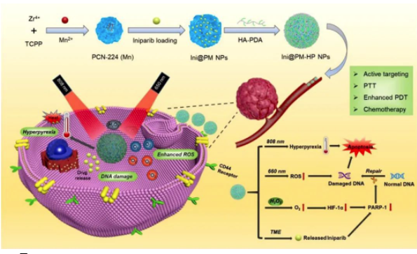 為了改進光動力療法的治療效果,研究團隊構建了一個可生物降解的產氧納米平臺(命名為Ini@PM-HP),由多孔金屬有機骨架(PCN-224(Mn))、核糖聚合酶(PARP)抑制劑和聚多巴胺修飾的透明質酸(HA-PDA)組成。因為透明質酸可以特異性結合腫瘤細胞上過度表達的透明質酸受體,Ini@PM-HP經靜脈注射后,將更多的積聚在腫瘤部位,然后釋放抑制劑,從而使腫瘤細胞DNA修復功能失調并促進細胞凋亡。