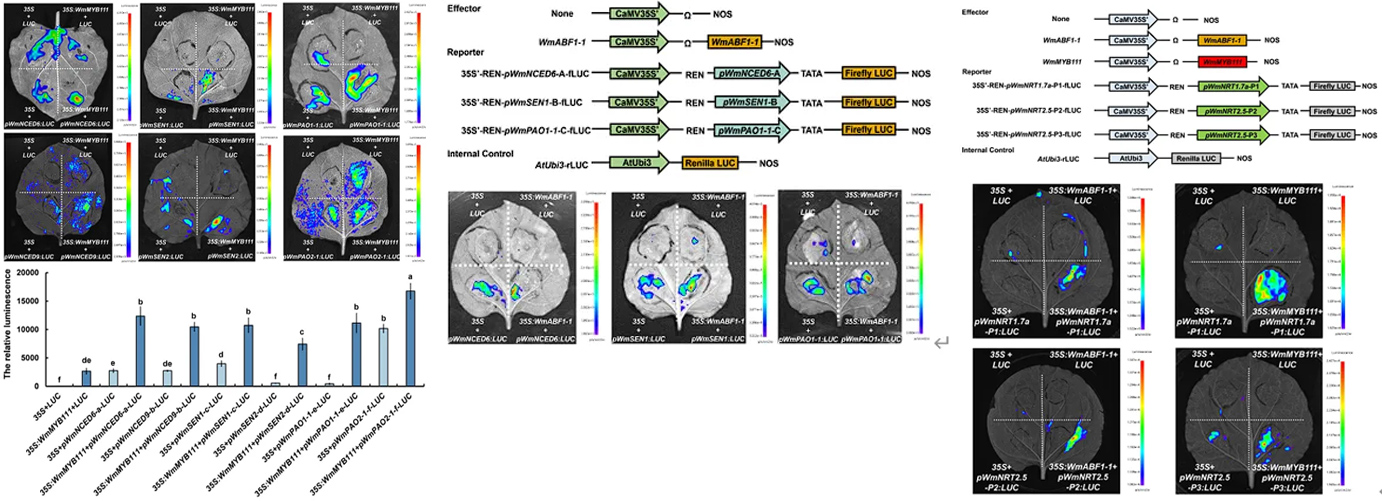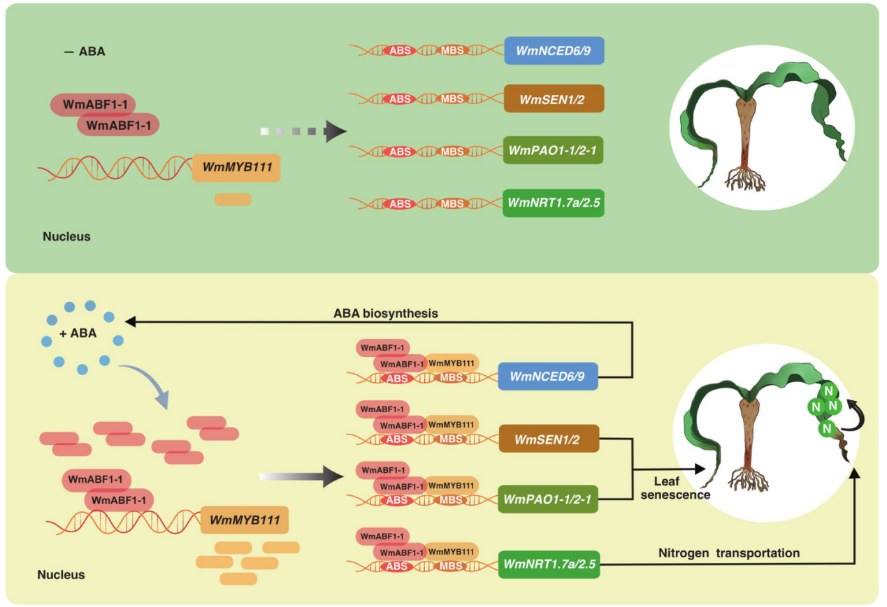 此外,葉片衰老過程伴隨氮的再分配,衰老區(qū)域的氮含量顯著降低而氮轉(zhuǎn)運基因(WmNRT1.7a、WmNRT2.5)被激活。低氮條件加速衰老,高氮則延緩,證實衰老與營養(yǎng)回收的緊密關(guān)聯(lián)。WmABF1-1與WmMYB111能直接激活WmNRTs啟動子,表明該模塊通過協(xié)調(diào)ABA積累、葉綠素降解和氮轉(zhuǎn)運,實現(xiàn)衰老過程的資源優(yōu)化利用。