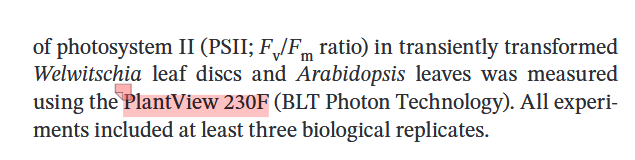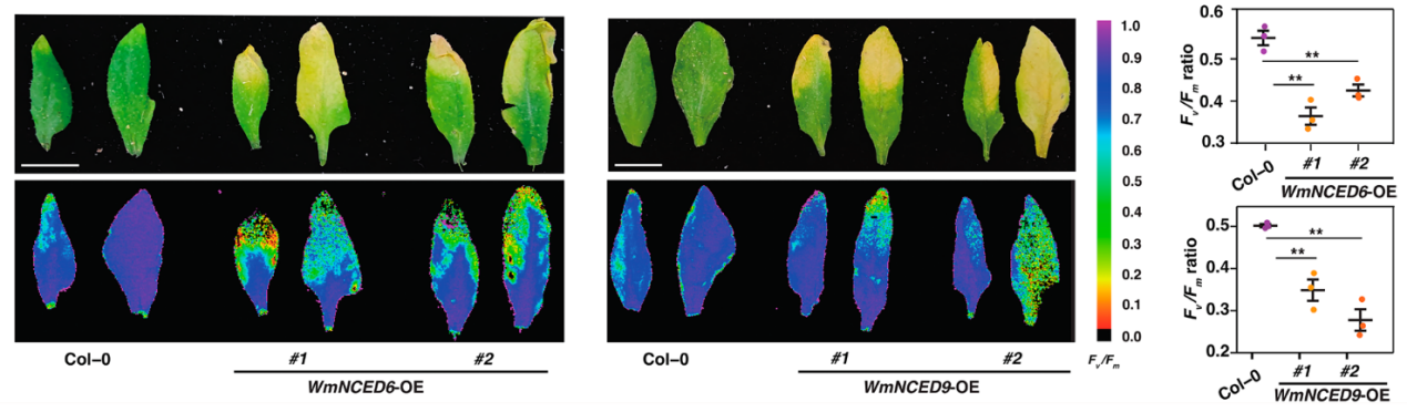 為了驗證百歲蘭ABA合成基因WmNCED6和WmNCED9是否具有驅(qū)動衰老的功能。研究者通過在擬南芥(Col-0野生型背景)中過表達(dá)這兩個基因(獲得轉(zhuǎn)基因株系WmNCED6-OE#1,2與WmNCED9-OE#1,2),檢測第三、第四蓮座葉的衰老表型,并利用廣州博鷺騰生物科技有限公司PlantView230F調(diào)制葉綠素?zé)晒饣铙w成像系統(tǒng)檢測光合效率(Fv/Fm)(圖2)。結(jié)果顯示:與野生型相比,所有過表達(dá)株系葉片均表現(xiàn)顯著加速衰老——葉片大面積黃化萎蔫(視覺表型),同時其Fv/Fm比值(光合作用核心指標(biāo))急劇下降,平均值從野生型的0.78 ± 0.02降至0.53 ± 0.03(p < 0.01),表明葉綠素降解導(dǎo)致光合功能嚴(yán)重受損。