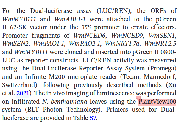 另外,為明確WmMYB111轉(zhuǎn)錄因子對其靶基因啟動子的激活能力,WmABF1-1對百歲蘭衰老核心基因的調(diào)控功能,以及WmABF1-1與WmMYB111對百歲蘭氮轉(zhuǎn)運基因(WmNRT1.7a與WmNRT2.5)的調(diào)控機制。在本氏煙草葉片中進(jìn)行雙熒光素酶實驗(圖5)。利用廣州博鷺騰生物科技有限公司PlantView植物活體成像系統(tǒng)檢測發(fā)現(xiàn):WmMYB111顯著增強所有其靶基因啟動子的活性;WmABF1-1對三類啟動子均具有顯著激活作用;WmMYB111顯著激活所有氮轉(zhuǎn)運基因啟動子片段活性,WmABF1-1則強烈抑制氮轉(zhuǎn)運基因上述啟動子。