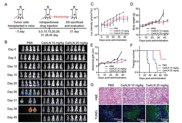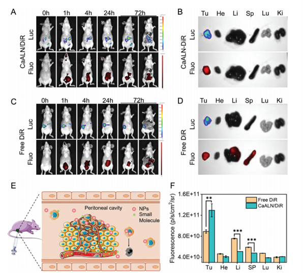 E) CaALN納米顆粒和小分子的體內(nèi)分布圖示。