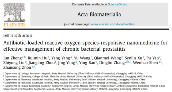 近日,重慶陸軍軍醫(yī)大學(xué)西南醫(yī)院泌尿外科周占松主任和沈文浩副主任研究團(tuán)隊(duì)在慢性細(xì)菌性前列腺炎的靶向治療方面取得了新的進(jìn)展,相關(guān)研究成果以“Antibiotic-loaded reactive oxygen species-responsive nanomedicine for effective management of chronic bacterial prostatitis”為題,發(fā)表在材料科學(xué)和生物材料類期刊《Acta Biomaterialia》(IF= 7.242,一區(qū)Top期刊)。
