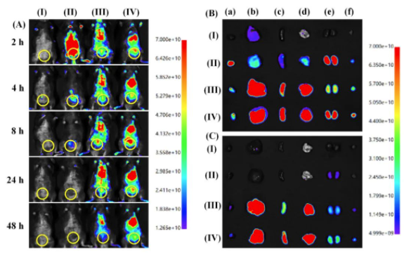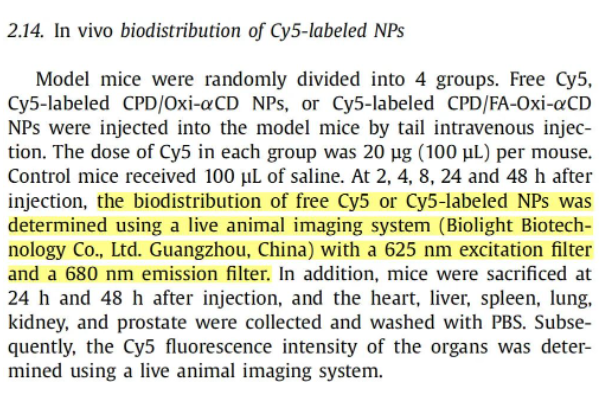 靜脈注射Cy5標(biāo)記的納米材料到CBP小鼠模型中,然后不同時(shí)間點(diǎn)使用AniView系列多模式動(dòng)物活體成像系統(tǒng)拍攝的熒光圖像