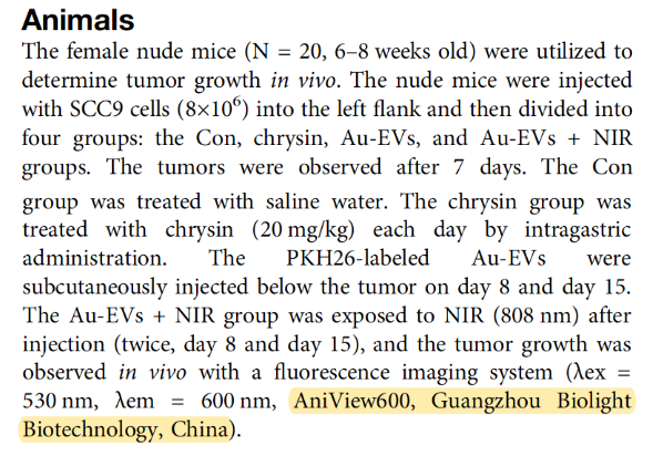文章中,研究 Au-EVs在體內(nèi)的抗腫瘤作用的實驗使用了博鷺騰AniView600多模式動物活體成像系統(tǒng)拍攝觀察。