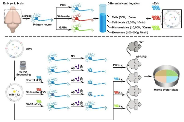 為了對該機(jī)制進(jìn)行進(jìn)一步闡釋,趙延欣教授及劉學(xué)源教授團(tuán)隊(duì)在本研究中用谷氨酸/GABA/PBS 處理原代培養(yǎng)的神經(jīng)元,并分離出 sEV。然后,將不同來源的 sEV 添加到用 Aβ(β淀粉樣蛋白)處理的神經(jīng)元或注射到 AD 模型小鼠中。此后對經(jīng) Aβ 治療的小鼠和神經(jīng)元進(jìn)行了評估。經(jīng)GABA 處理的神經(jīng)元釋放的 sEVs 減輕了 Aβ 誘導(dǎo)的損傷,而谷氨酸處理的神經(jīng)元釋放的 sEVs 加重了 Aβ 的毒性。此外,本研究通過 miRNA 測序比較了從谷氨酸/GABA/PBS 處理的神經(jīng)元中分離的 sEV 的 miRNA 組成。該研究進(jìn)一步表明,sEV 中 miR-132 的變化加速了表征病理的生化改變。
