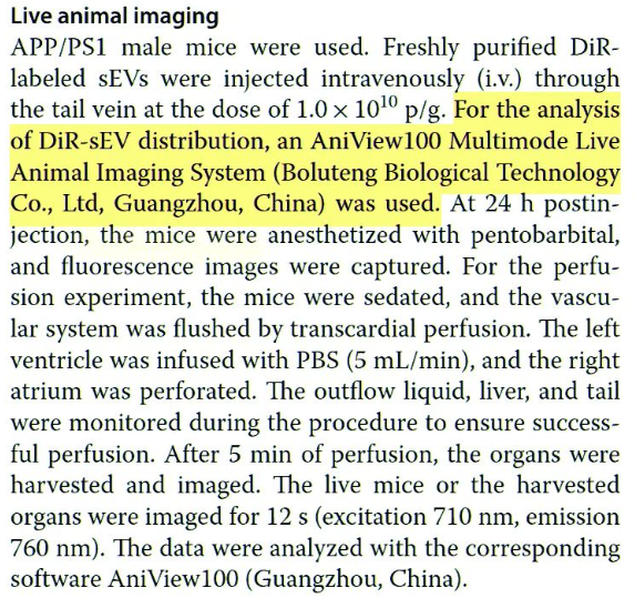 文章中,在評估在小鼠體內(nèi)系統(tǒng)傳遞的 sEVs 的分布的實(shí)驗(yàn)中,使用了博鷺騰AniView100多模式動物活體成像系統(tǒng)拍攝。