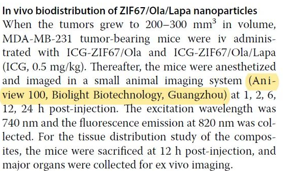 文章中,驗(yàn)證ZIF67/Ola/Lapa納米顆粒在MDA-MB-231荷瘤小鼠體內(nèi)的分布和腫瘤靶向性活體實(shí)驗(yàn)成像,使用了博鷺騰AniView100多模式動物活體成像系統(tǒng)拍攝。