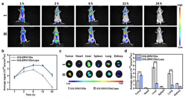a、ICG-ZIF67/Ola和ICG-ZIF67/Ola/Lapa靜脈給藥后在小鼠體內(nèi)的分布情況,紅色圓圈代表腫瘤。