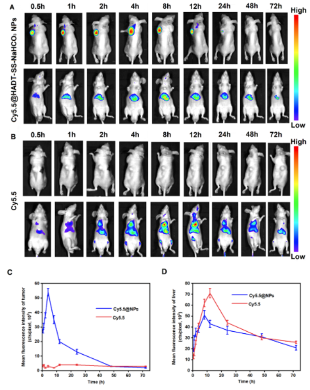 圖3|負載Cy5.5的HADT-SS-NaHCO3NPs(A)和具有等效Cy5.5濃度(0.2 mg/kg)的游離Cy5.5溶液(B)在C4-2荷瘤小鼠中的體內(nèi)生物分布。靜脈注射后0.5、1、2、4、8、12、24、48和72小時,用AniView100獲得的小鼠背部和前部的體內(nèi)熒光圖像,一列代表同一只裸鼠的正面和背面。(C)和(D)為腫瘤組織和肝臟熒光強度的定量分析