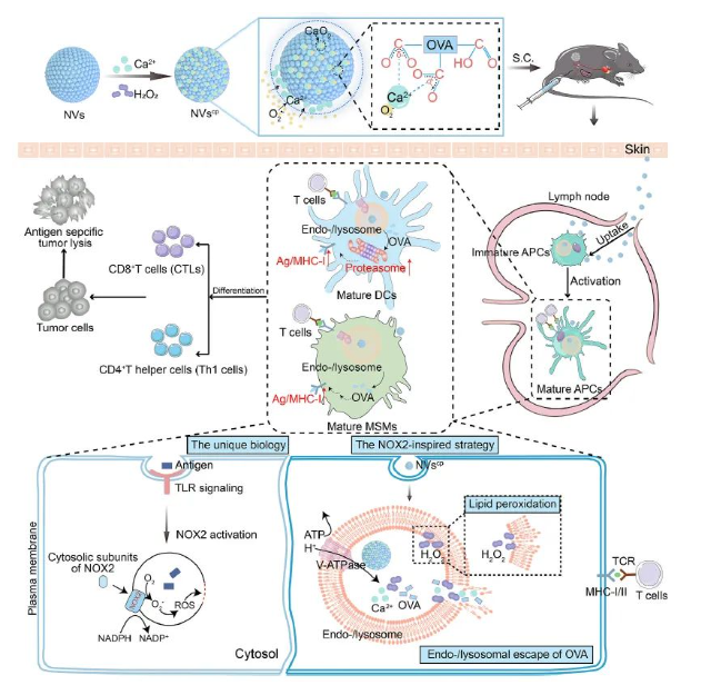 受NOX2機制的啟發(fā),李永勇教授團隊設(shè)計了一種名為NVscp的生物礦化納米疫苗。NVscp通過在模型抗原卵清蛋白(Ova)自組裝的納米疫苗(Nvs)上原位生長過氧化鈣而發(fā)展起來,具有超高的Ova抗原密度,并含有必要的過氧化鈣佐劑(8.9%)。過氧化鈣佐劑響應(yīng)內(nèi)溶酶體的酸性環(huán)境,觸發(fā)ROS的釋放,進而形成脂質(zhì)氫過氧化物,導(dǎo)致內(nèi)溶酶體脂質(zhì)過氧化。因此,NVscp被賦予內(nèi)溶酶體逃逸能力,以實現(xiàn)抗原交叉提呈的胞漿轉(zhuǎn)運。體內(nèi)實驗表明,NVscp的大小可以有效地滯留在引流淋巴結(jié)(dLNs)中,從而增強不同的APCs(特別是髓竇巨噬細(xì)胞(MSMs,F(xiàn)4/80+CD169+))和樹突狀細(xì)胞(DCs,CD11c+F4/80-)的抗原交叉提呈,有效地促進腫瘤特異性CD8+CTL和CD4+T輔助細(xì)胞(Th1細(xì)胞)的激活,用于癌癥免疫治療。