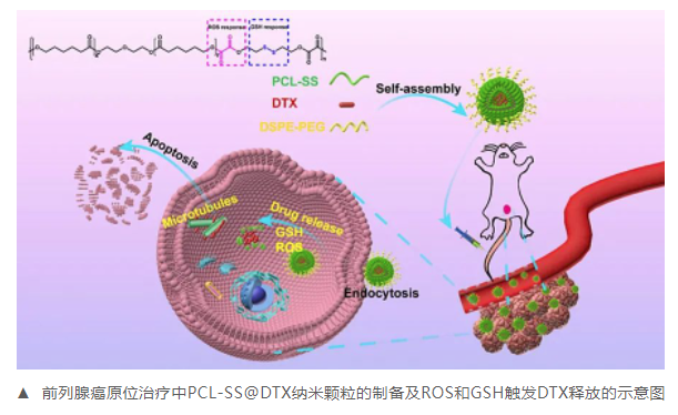 隨著納米藥物的發(fā)展,利用腫瘤微環(huán)境響應(yīng)性的載藥納米傳遞系統(tǒng)已成為一種很有前途的腫瘤化療策略。腫瘤細(xì)胞相比正常細(xì)胞,會(huì)產(chǎn)生更高水平的活性氧(Reactive oxide species, ROS),具有活性氧響應(yīng)性功能基團(tuán)(如草酸酯鍵、硫酮)的載藥納米顆粒在腫瘤細(xì)胞中可以發(fā)生化學(xué)結(jié)構(gòu)的變化,進(jìn)而觸發(fā)藥物釋放;同樣,腫瘤細(xì)胞中的谷胱甘肽(Gltathione,GSH)水平比細(xì)胞外基質(zhì)高出1000倍,含有二硫鍵(Disulfide bonds, SS)的谷胱甘肽反應(yīng)性載藥納米顆粒也能在腫瘤細(xì)胞內(nèi)優(yōu)先釋放藥物。目前已有載藥納米顆粒被開發(fā)出來同時(shí)對(duì)ROS和GSH做出反應(yīng),這為PCa化療設(shè)計(jì)無毒、雙重響應(yīng)性納米顆粒具有重要的參考意義。