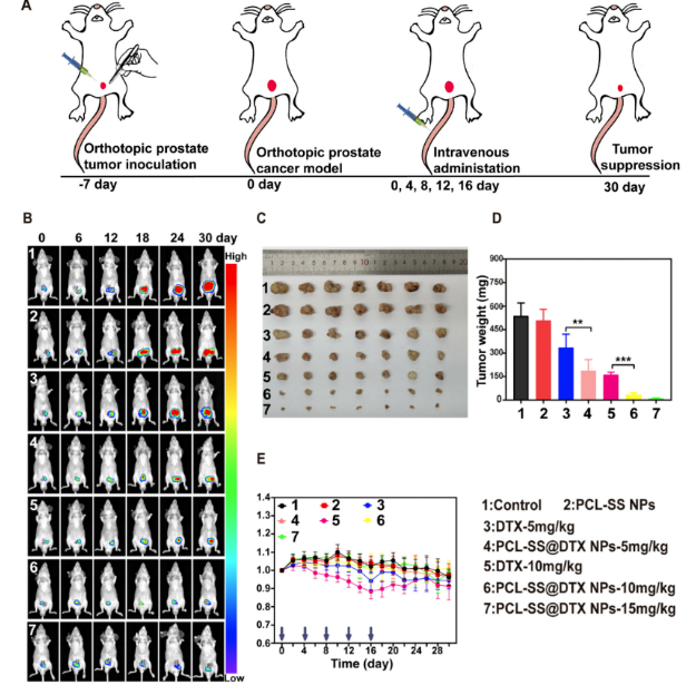 前列腺癌(Prostate cancer, PCa)是男性最常見的腫瘤之一。對(duì)于局部晚期和轉(zhuǎn)移性前列腺癌,雄激素去勢(shì)治療最初有效,但最終會(huì)發(fā)展為耐去勢(shì),導(dǎo)致治療效果差,死亡率高。紫杉醇(Docetaxel, DTX),一種紫杉烷類藥物,已被證實(shí)可以延長(zhǎng)總生存期的標(biāo)準(zhǔn)化療藥物;然而,因?yàn)槟退幮院蛧?yán)重的副作用,限制了其在癌癥化療中的應(yīng)用。因此,需要開發(fā)生物相容的藥物釋放平臺(tái)以減少目前化療的全身副作用,提高抗癌效果。