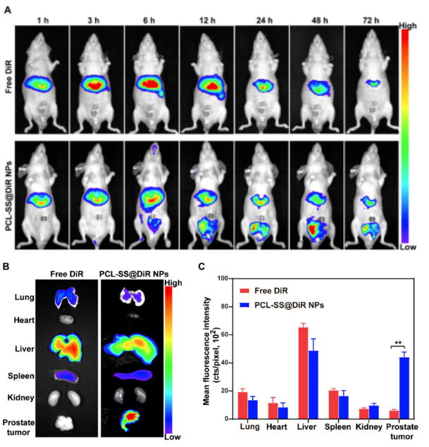 (A)、DU145荷瘤小鼠靜脈注射游離DiR和PCL-SS@DiR納米顆粒后的體內(nèi)熒光圖像。