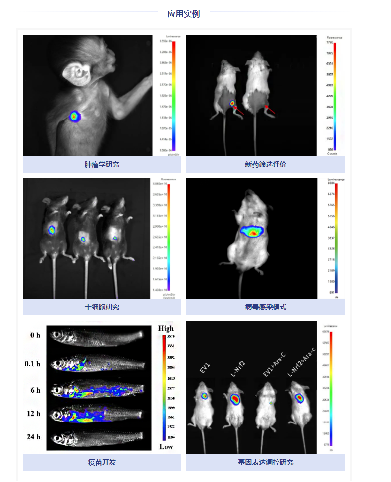 (B)、使用博鷺騰AniView100拍攝的DU145荷瘤小鼠經(jīng)不同藥物組處理后的體內(nèi)生物發(fā)光圖像。