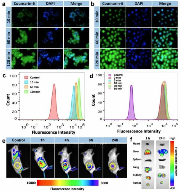 胞細攝取OA-GA-PTX NPs的能力及RhB標記的OA-GA NPs在體內的生物分布。a-b、OA-GA-Ce6 NPs與4T1和MCF-7細胞孵育不同時間的代表性圖像(a表示4T1細胞,b表示MCF-7細胞)(×400);c、流式細胞術分析細胞吞噬OA-GA-Ce6 NPs的功能;d、流式細胞術分析熒光染料在細胞內的釋放情況;e、博鷺騰多模式動物活體成像系統(tǒng)拍攝的特定時間點NPs在腫瘤的分布;f、注射RhB標記的OA-GA NPs后不同時間點安樂死4T1荷瘤小鼠腫瘤和正常組織的體外熒光成像。