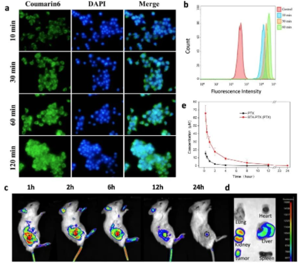 BTA-PTX NPs細胞體外攝取和體內生物分布。a、熒光倒置顯微鏡觀察4T1細胞攝取BTA-PTX NPs,攝取量隨時間增加(×400);b、流式細胞術定量研究4T1細胞攝取BTA-PTX NPs情況;c、將熒光標記的BTA-PTX NPs經尾靜脈注射到小鼠體內,博鷺騰多模式動物活體成像系統(tǒng)監(jiān)測NPs的腫瘤靶向性;d、腫瘤和正常組織的體外熒光成像,NPs主要積聚在腎臟和腫瘤組織;e、給藥后血藥濃度-時間曲線,BTA-PTX血藥濃度明顯高于PTX。