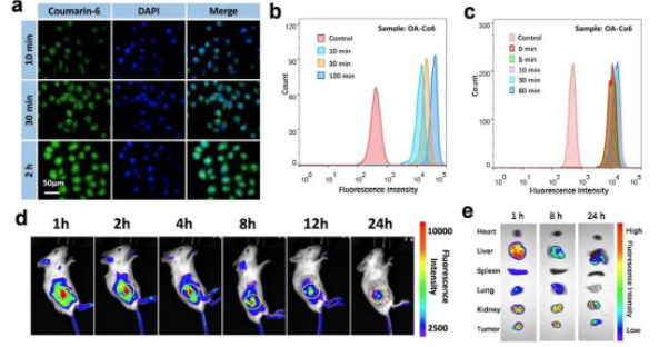 MCF-7細胞攝取OA-PTX NPs的能力及RhB標記的OA NPs在荷瘤小鼠體內的分布。a、不同孵育時間OA-Ce6 NPs與MCF-7細胞的代表性圖像(×400);b、流式細胞儀分析細胞吞噬OA-CE6 NPs的情況;c、流式細胞術分析熒光染料在細胞內的釋放情況;d、博鷺騰多模式動物活體成像系統(tǒng)拍攝的特定時間點NPs在腫瘤的分布;e、注射RhB標記的OA NPs后不同時間點安樂死4T1荷瘤小鼠腫瘤和正常組織的體外熒光成像。