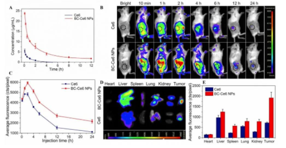 BC-Ce6 NPs在體內的血液循環(huán)和生物分布情況。A、靜脈注射BC-Ce6 NPs或游離Ce6后血液中Ce6的濃度-時間分布;B、博鷺騰多模式動物活體成像系統(tǒng)拍攝的靜脈注射4T1荷瘤小鼠BC-Ce6NPs或等效濃度Ce6后的體內熒光圖像;C、B內腫瘤部位的平均熒光強度;D、注射24小時后采集的主要器官和腫瘤的體外熒光成像;E、D中從體外器官獲得的熒光強度。