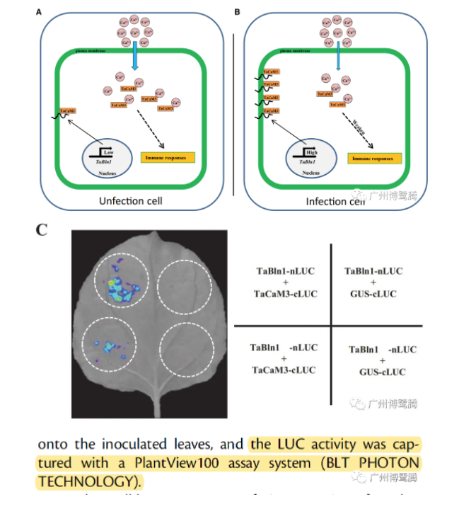 此外,作者還發(fā)現(xiàn)TaBln1與細(xì)胞膜上的鈣調(diào)蛋白TaCaM3發(fā)生相互作用。鈣調(diào)蛋白是鈣信號通路的關(guān)鍵成分,在植物感知外界脅迫過程中發(fā)揮重要作用。通過沉默TaCaM3基因,Pst的感染面積和產(chǎn)孢量均有所增加,小麥對Pst抗性下降。同時(shí),非損傷技術(shù)和幾丁質(zhì)處理實(shí)驗(yàn)表明,短暫沉默TaCaM3可導(dǎo)致小麥葉肉細(xì)胞中Ca2+內(nèi)流的減少,而TaBln1的沉默則導(dǎo)致Ca2+內(nèi)流顯著增加。以上研究結(jié)果表明,TaBln1通過影響TaCam3和Ca2+之間的平衡來負(fù)調(diào)節(jié)小麥對Pst的抗性,并且TaCam3可能是TaBln1在小麥對Pst感染的反應(yīng)中的靶點(diǎn)。
