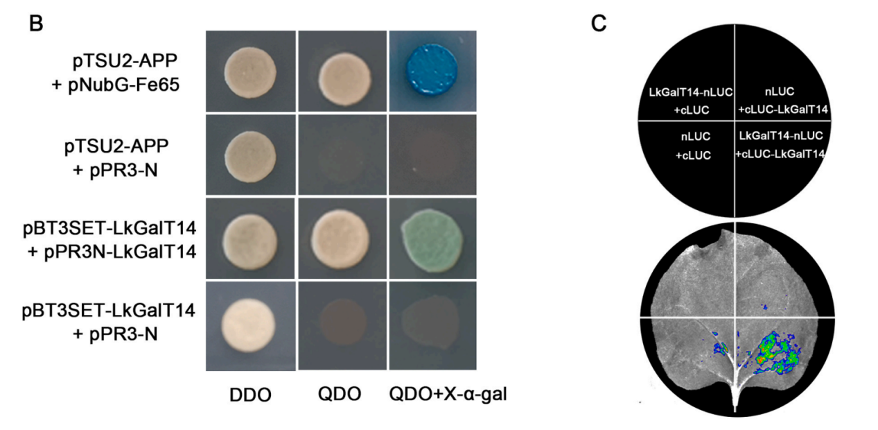 (C)熒光素酶互補(bǔ)成像檢測(LCI)。在煙草(N. benthamiana)葉片中瞬時(shí)表達(dá)融合了 nLUC 或 cLUC 構(gòu)建的 LkGalT14 蛋白