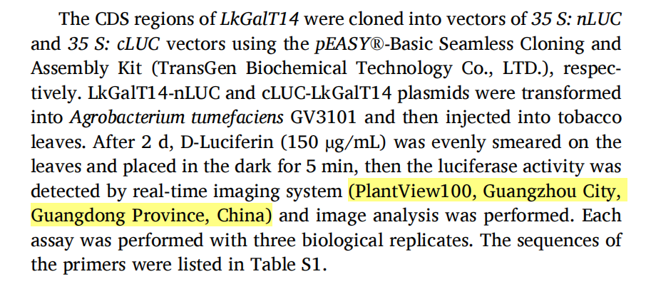 為了檢測 LkGalT14 能否形成同源二聚體,作者進(jìn)行了酵母雙雜交試驗(yàn)以及利用博鷺騰PlantView系列植物活體成像系統(tǒng)進(jìn)行了熒光素酶互補(bǔ)成像檢測(LCI)。結(jié)果表明,LkGalT14可與自身相互作用,表明LkGalT14可能通過形成同源二聚體發(fā)揮作用。該研究對發(fā)現(xiàn)AG合成相關(guān)基因和加速AG合成調(diào)控機(jī)制的研究具有重要意義。