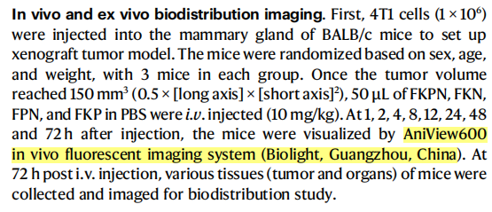在向小鼠體內(nèi)注射FKPN、FKN、FPN、FKP 50 μL (10mg/kg)后的體內(nèi)及離體器官成像實(shí)驗(yàn)中使用博鷺騰AniView系列多模式動(dòng)物活體成像系統(tǒng)進(jìn)行拍攝。